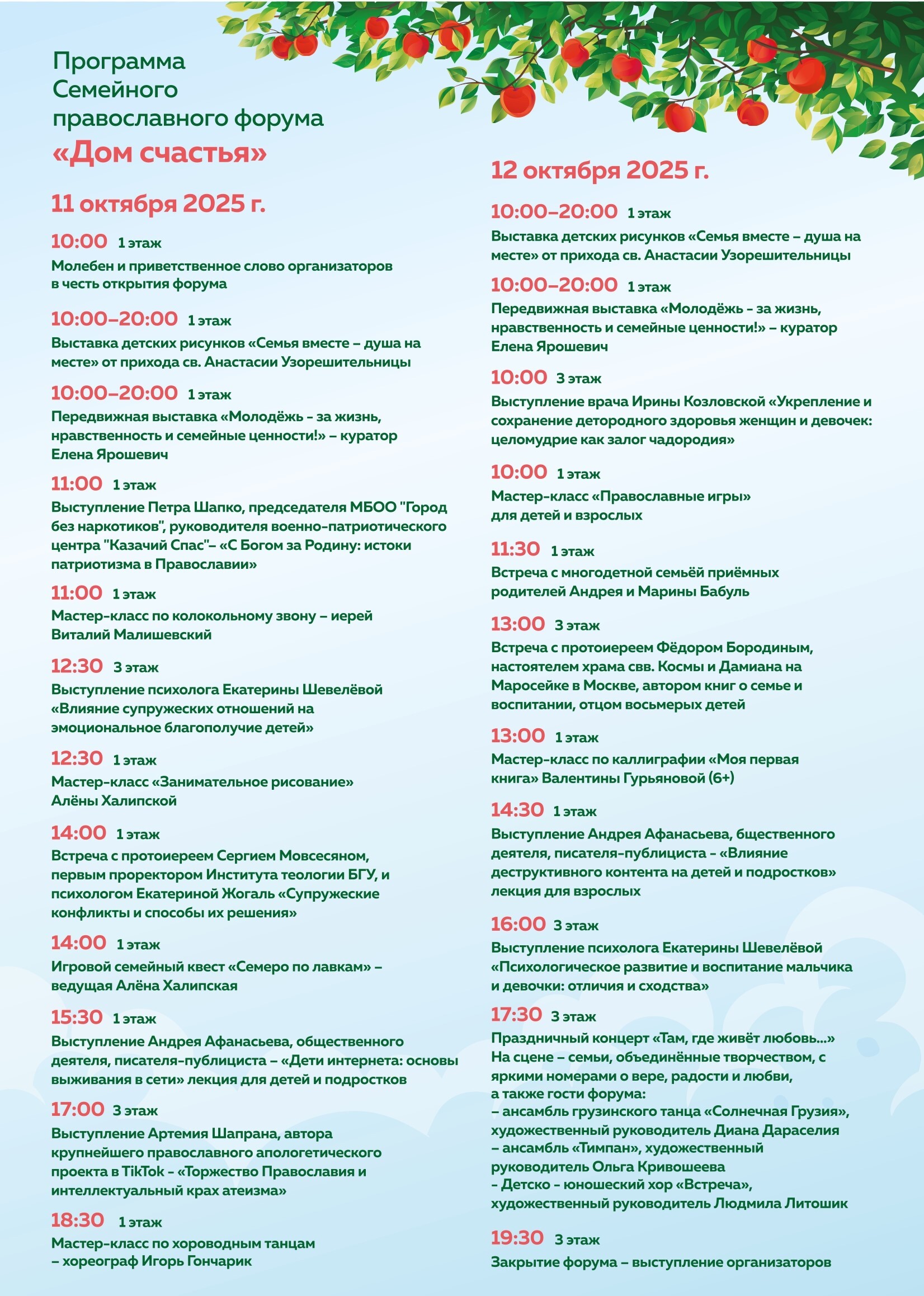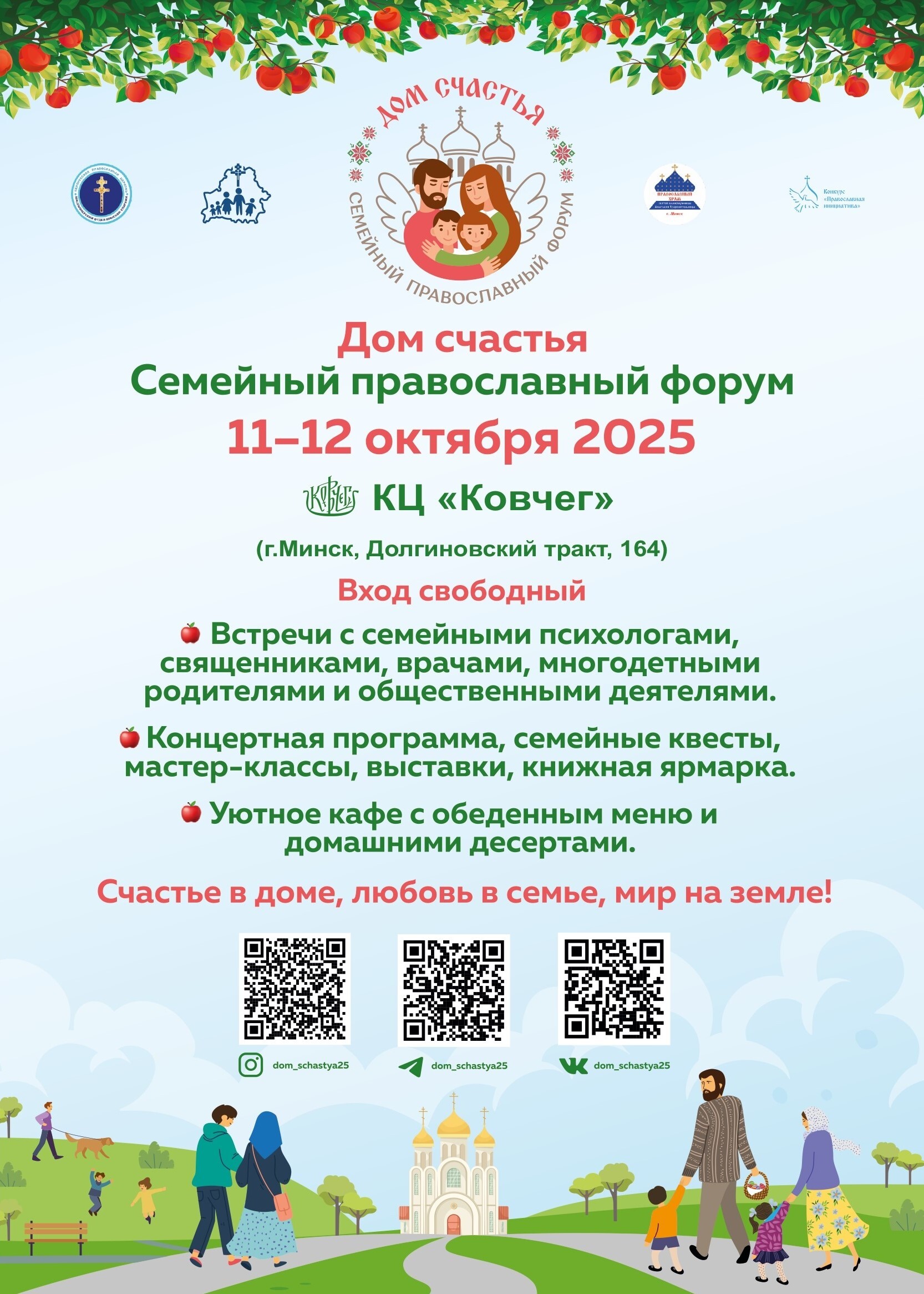 Семейный православный форум «Дом счастья» пройдет в Минске 11−12 октября по благословению Митрополита Минского и Заславского Вениамина, Патриаршего Экзарха всея Беларуси. Целью форума является популяризация традиций православной семьи, стремление дать каждому желающему возможность прикоснуться к подлинному пониманию семьи и её значения в жизни человека.